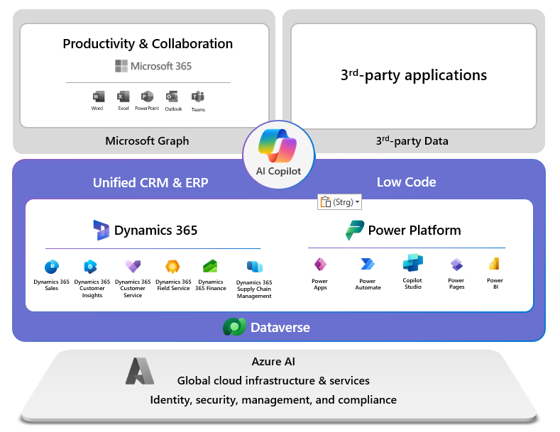 Microsoft hat mit dem neuen Konzept für Unternehmenslösungen die bisherigen Dynamics CRM- und ERP-Lösungen aus der Azure Cloud zu einem umfassenden Dienst (Microsoft Dynamics 365) vereint. Ihnen stehen leistungsstarke Funktionen für Finanzen, Verkauf und Einkauf, Logistik, Produktion, Projekt-Management, Kundendienst/Service, Marketing und Personal-Management zur Verfügung. Effiziente Unterstützung der täglichen Arbeiten mit Copilot und aussage kräftige Auswertung zur Unternehmensführung mit Power BI sowie die Integration in Office 365 komplettieren das Angebot, sodass Sie eine zukunftsfähige Plattform für Wachstum und Erfolg erhalten.