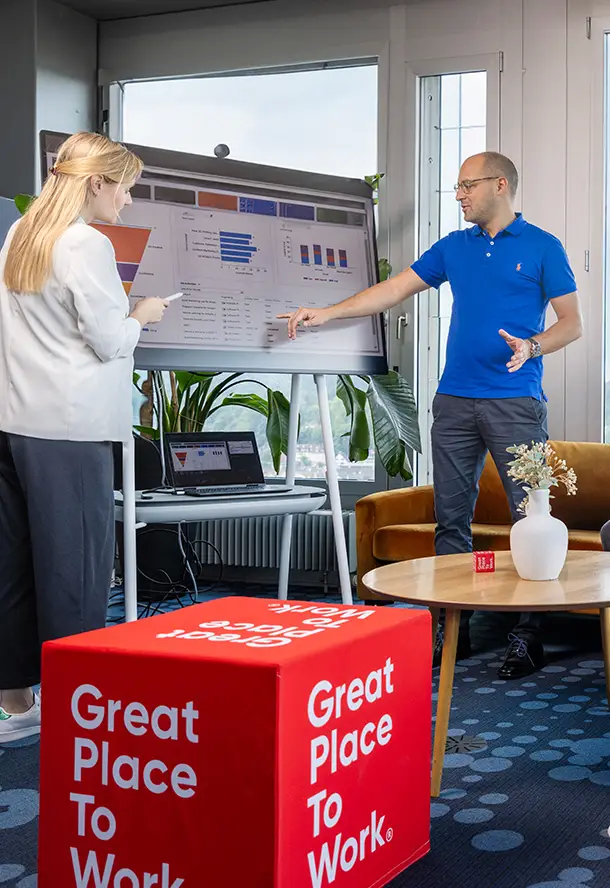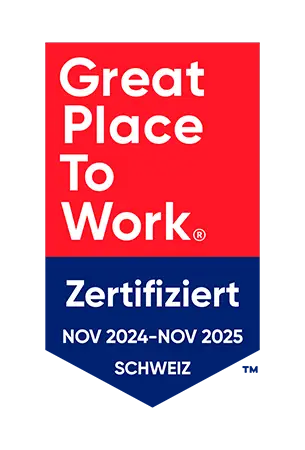 Nach 2021 und 2022 haben wir auch 2024 die beliebte Zertifizierung Great Place to Work® für die Schweiz erhalten. Das unabhängige Forschungs- und Beratungsinstitut Great Place to Work® konnte uns damit dank des positiven Feedbacks unserer Mitarbeiterinnen und Mitarbeiter in der Schweiz, in Deutschland, Österreich und Rumänien dieses Siegel ausstellen.